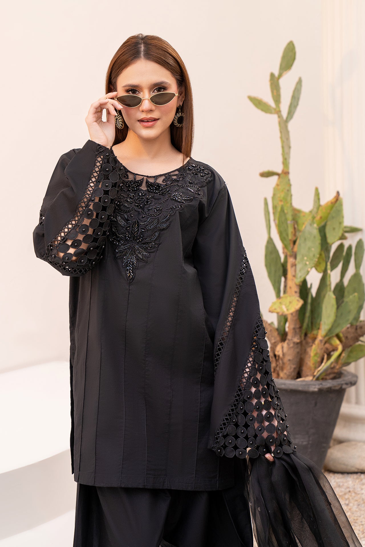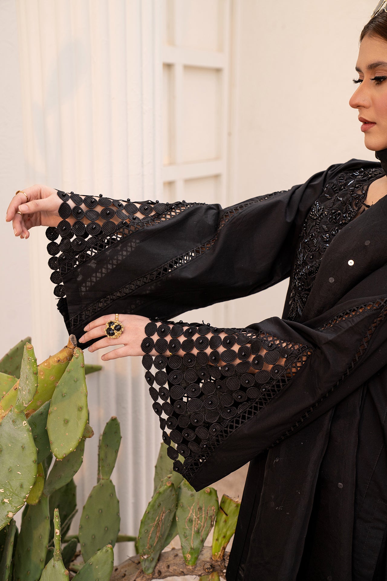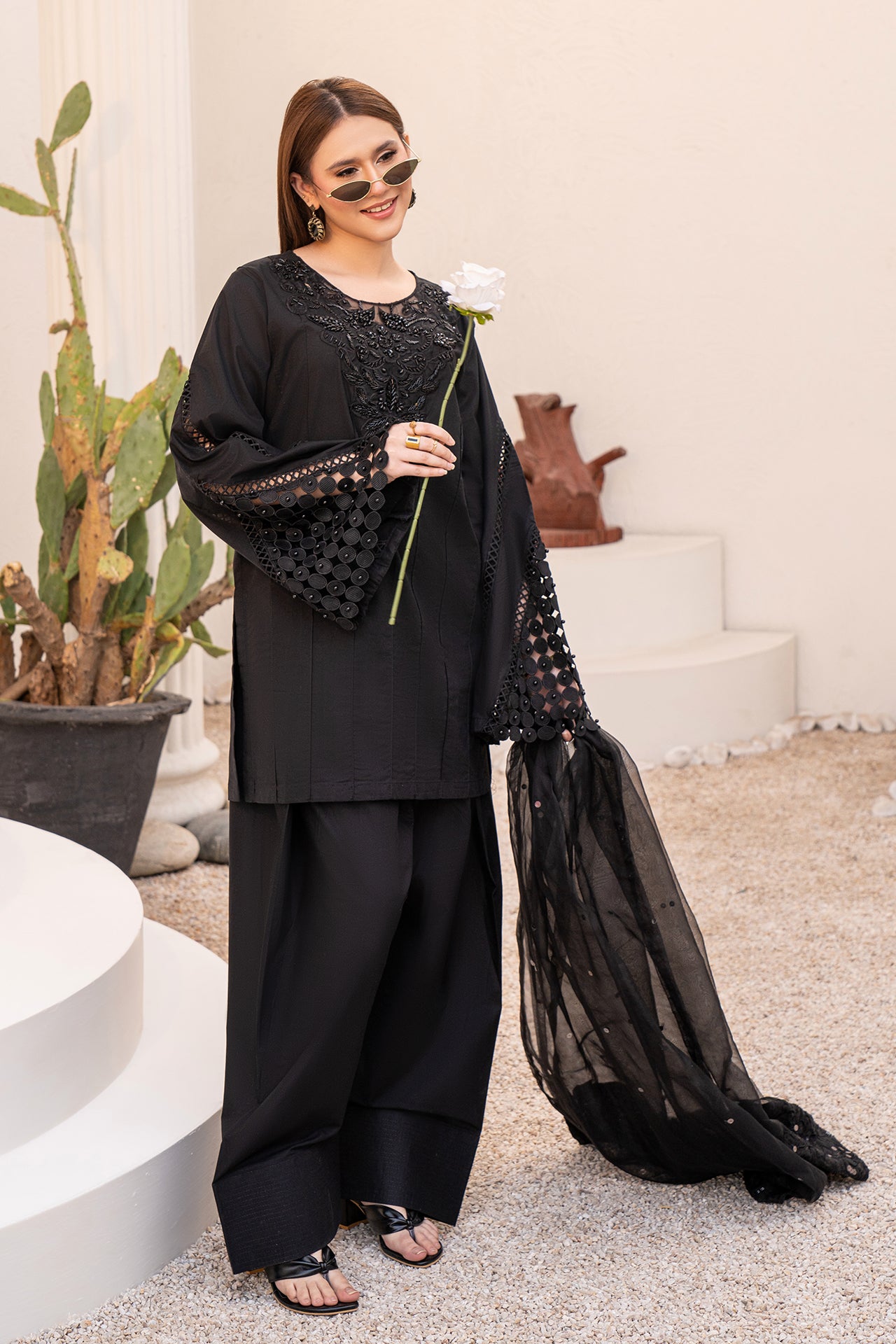 Exude timeless elegance with this exquisite 3-piece stitched viscose ensemble, designed to perfection with intricate craftsmanship. The farshi shalwar is paired with a beautifully pleated front kameez, featuring a delicately adorned neckline on adda work, embellished with hand-placed pearls, kulfi, pipe, sequins, and stones, all in striking black. The sleeves are enhanced with crochet lace and pearl detailing, adding a graceful finish. Completing the look is a sheer organza dupatta, embellished with hand-sequins throughout and bordered with heavily embroidered viscose patches on both pallus, finished with fine cutwork. A masterpiece of artistry, sophistication, and timeless charm.