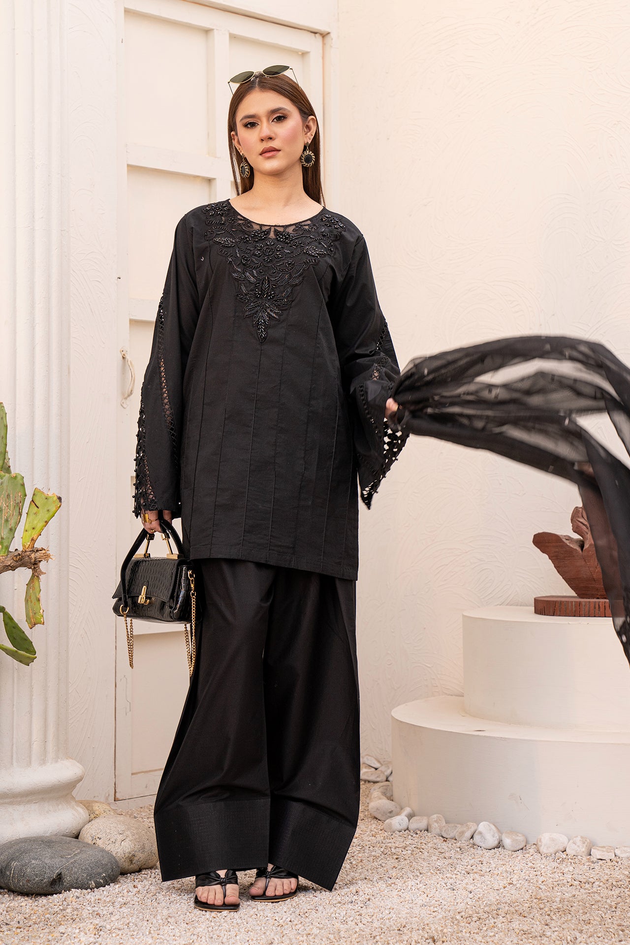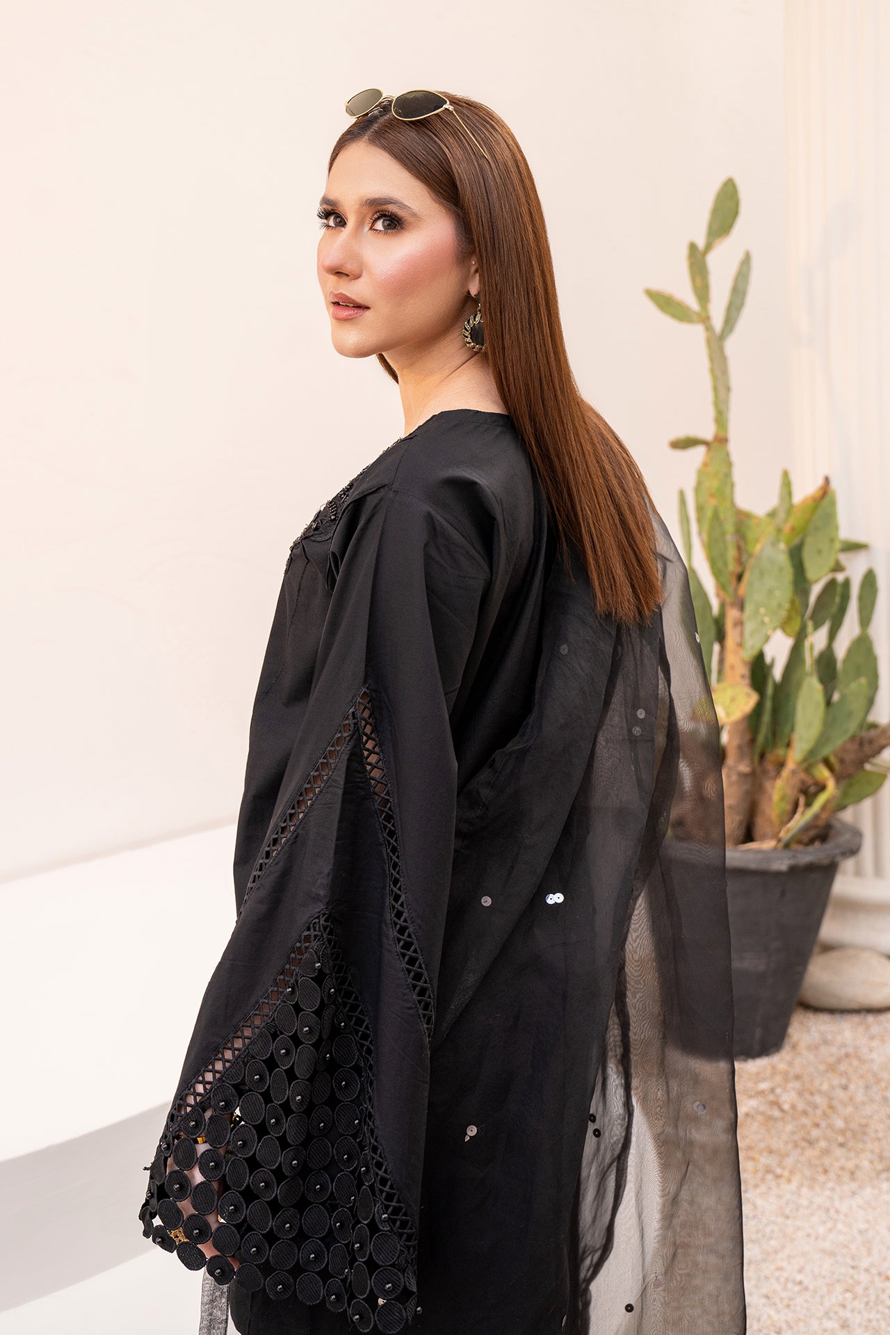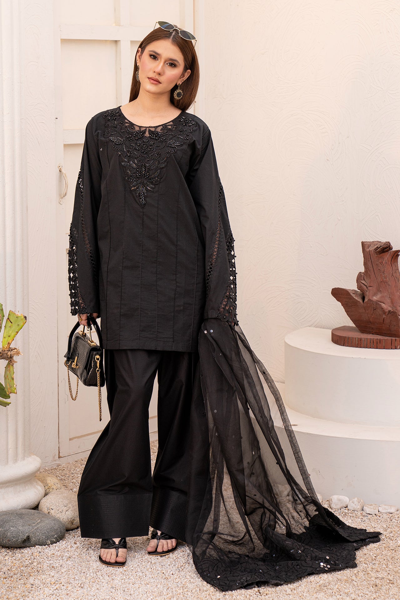 Exude timeless elegance with this exquisite 3-piece stitched viscose ensemble, designed to perfection with intricate craftsmanship. The farshi shalwar is paired with a beautifully pleated front kameez, featuring a delicately adorned neckline on adda work, embellished with hand-placed pearls, kulfi, pipe, sequins, and stones, all in striking black. The sleeves are enhanced with crochet lace and pearl detailing, adding a graceful finish. Completing the look is a sheer organza dupatta, embellished with hand-sequins throughout and bordered with heavily embroidered viscose patches on both pallus, finished with fine cutwork. A masterpiece of artistry, sophistication, and timeless charm.