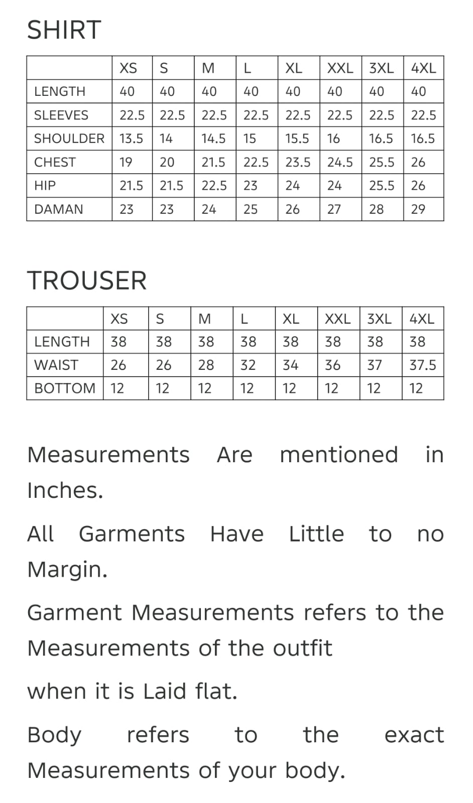 Shirt length is 40 inches which is constant in all sizes