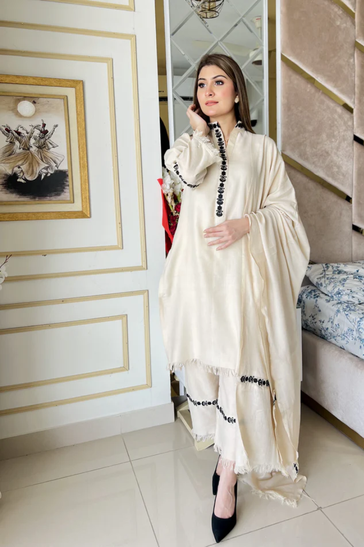 Elegant 3 Piece Stitched Dhanak dress, featuring a shirt with detailed neckline embroidery and embroidered sleeves. The box-style trousers showcase intricate embroidery, while the shawl is beautifully embroidered on both pallus. Delicate feather detailing enhances the front and back of the shirt, sleeves, trousers, and both pallus of the shawl. This sophisticated ensemble combines modern style with traditional craftsmanship, perfect for any special occasion.